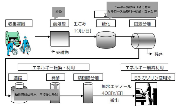3)エタノール化…食品廃棄物のうち、とうもろこし、麦などの穀物類、サツマイモ、ジャガイモなどのでんぷん質系と、サトウキビや甜菜などの糖質系を原料とし、微生物反応によりエタノールを精製する技術。石油などの化石燃料の代替として扱われ、燃やしたときに出る二酸化炭素は植物が吸収し、再放出したものなので、大気中の二酸化炭素が増えず、地球温暖化の防止につながります。また、ガソリンの消費量を減らし、原油高の高騰を緩和できることもメリットです。しかし、エタノール化の製造過程でコストがかかることや、食料との競合によりって食料となる作物の量が減少し、物価が高騰する恐れもあることがデメリットです。