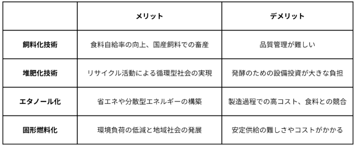 最後に、廃棄物系バイオマスの利用用途四種類についてのメリット・デメリットを簡単にまとめたものを紹介します。