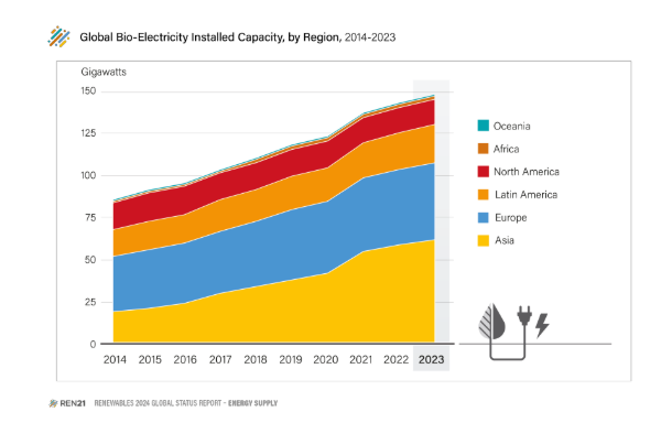 下の左の図は世界の地域別のバイオマス発電量の推移です。発電のほとんどはアジアとヨーロッパが行っている事がわかります。さらに、発電量は年々増加傾向にあり、アジアでは2020年から増加幅が大きくなっています。また、下の右の図を見ても分かる通り、少しずつではありますが、世界の発電量でのバイオマス発電の割合が年々増加しています。