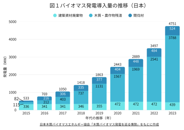 バイオマス発電の導入量は下の図のように年々増加傾向にあります。図1は日本のバイオマス発電導入量の推移を表しています。