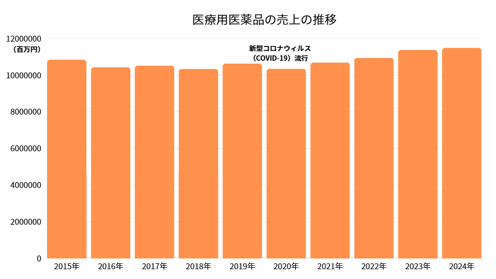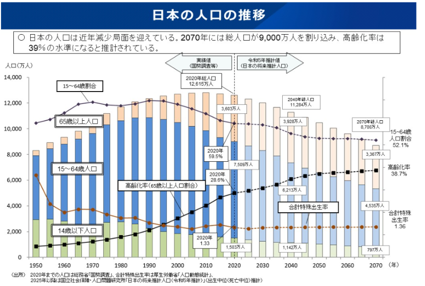 医療用医薬品は、病気の治療に欠かせない存在です。2025年4月時点で、日本では約13,000品目の医療用医薬品が使われており、年間の売上は約11兆円にものぼります。(図1)新型コロナウイルスの流行により2020~2021年には一時的に売上が減少しましたが、これは多くの人が受診を控えたことで、処方される薬の量が減ったためです。 現在、日本では少子高齢化が進み、人口が減少しています。(図2)その一方で、高齢者の数が増えることで慢性的な病気を抱える人も多くなっています。そのため、将来的に薬の需要が少なくなる可能性もありますが、高齢者の医療ニーズが高いため、薬の需要は依然として高い水準にあります。 医療用医薬品は、ただ治療に使われるだけではなく、国のお金の流れ(経済)にも大きな影響を与えている重要な分野です。私たちの健康と社会の仕組みを支える、大切な役割を担っています。