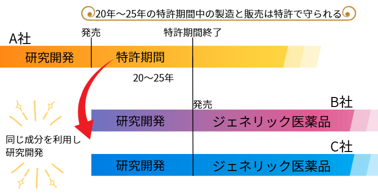 製薬メーカーが開発した新薬(先発医薬品)は、特許期間が終了すると、他の企業も同じ有効成分を使って薬を製造・販売できるようになります。このように先発医薬品の後に発売される薬を後発医薬品(ジェネリック医薬品)と呼びます。