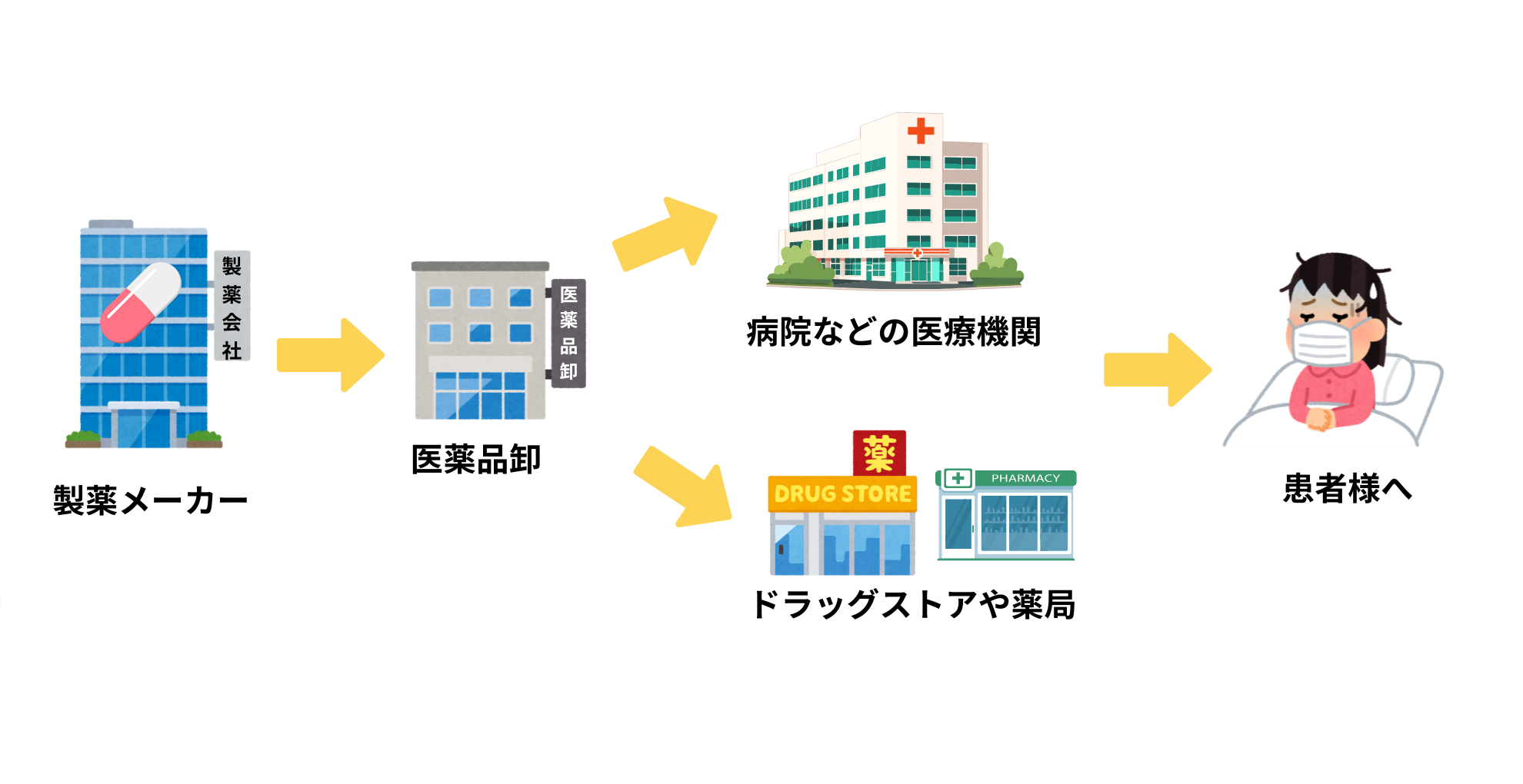 医療用医薬品は、基本的に「医薬品メーカー(製薬会社)」から「医薬品卸」を通じて、「病院などの医療機関」や「ドラッグストアや薬局」へ届けられ、最終的に患者様など必要とする方のもとへ提供されます。