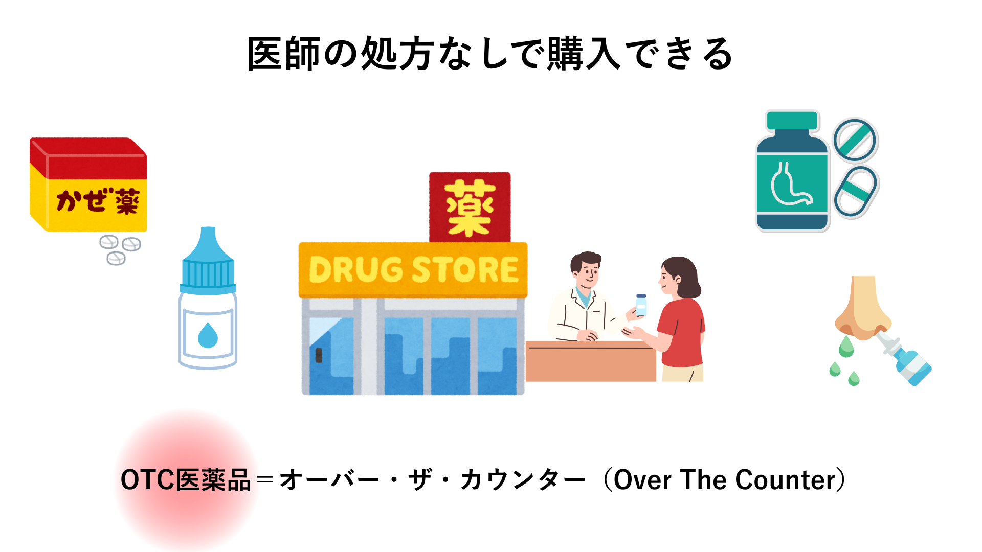 一般用医薬品(OTC医薬品)は、ドラッグストアや薬局などで処方箋なしで購入できる薬です。店頭のカウンター越しで販売されることから、オーバー・ザ・カウンター(Over The Counter)の略称で『OTC医薬品』と呼ばれています。風邪薬や胃腸薬、ビタミン剤などがあり、比較的軽い症状の改善や健康維持に使われます。使用上の注意や用法を守ることで安全に使用できます。