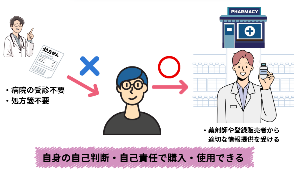 薬局やドラッグストアで購入できる市販薬を「OTC医薬品」といいますが、その中で医師から処方される医療用医薬品のうち、副作用が少なく安全性の高いものを市販薬として転用したものを「スイッチOTC医薬品」と呼びます。成分は医療用医薬品と同じですが、薬剤師や登録販売者から適切な情報提供を受け、ご自身の自己判断・自己責任で購入・使用できるお薬です。スイッチOTC医薬品は、使用実績が十分で副作用の心配が少ない医薬品が選ばれ、一般用医薬品として認可・転用されています。OTCとはオーバー・ザ・カウンター(Over The Counter)の略で、店頭で購入できることを意味します。
