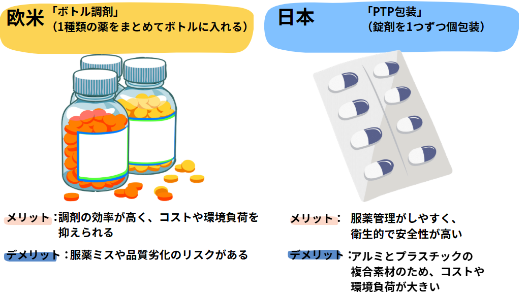 日本の医療用医薬品の包装や調剤方法の特徴、その利点や課題について教えてください。また、海外との違いについても是非教えてください。