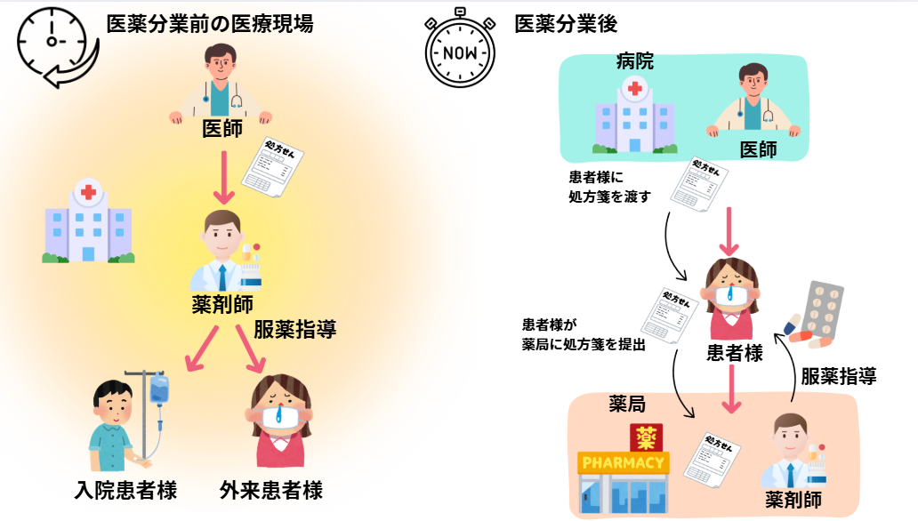 | 1997年以降 | 厚生省(当時)が37のモデル国立病院へ完全分業(院外処方箋受取率70%以上)を指示。これを契機に分業が急速に進展 |
