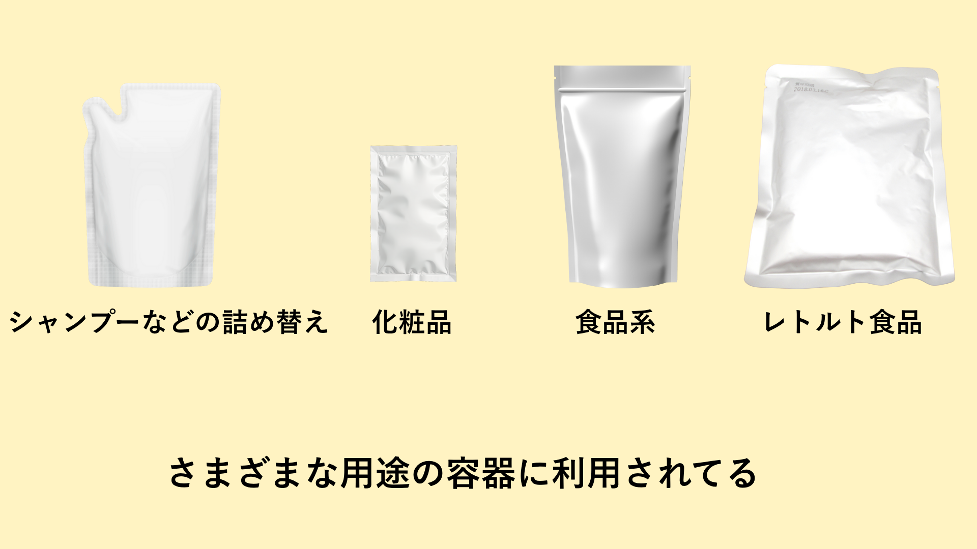 | 多様な形状・機能 | 用途に応じて形状や機能を変えられるのが特徴です。持ち手付き・電子レンジ対応パウチなど、多様なタイプがあり、製品の付加価値やデザイン性を高めることができます。 |