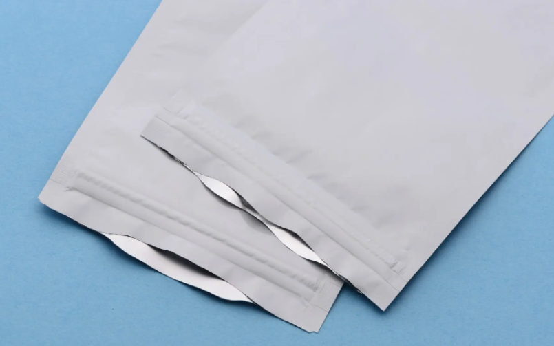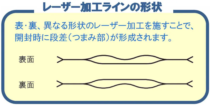 上記画像は、株式会社カナエの段差カットパウチです。袋の表裏で異なる形状に施したレーザー加工ラインと、左右に設けられたノッチ(小さなくぼみや切り込み)によって、開封時に段差ができてつまみやすくなり、利き手に関係なくスムーズに開けることができます。
