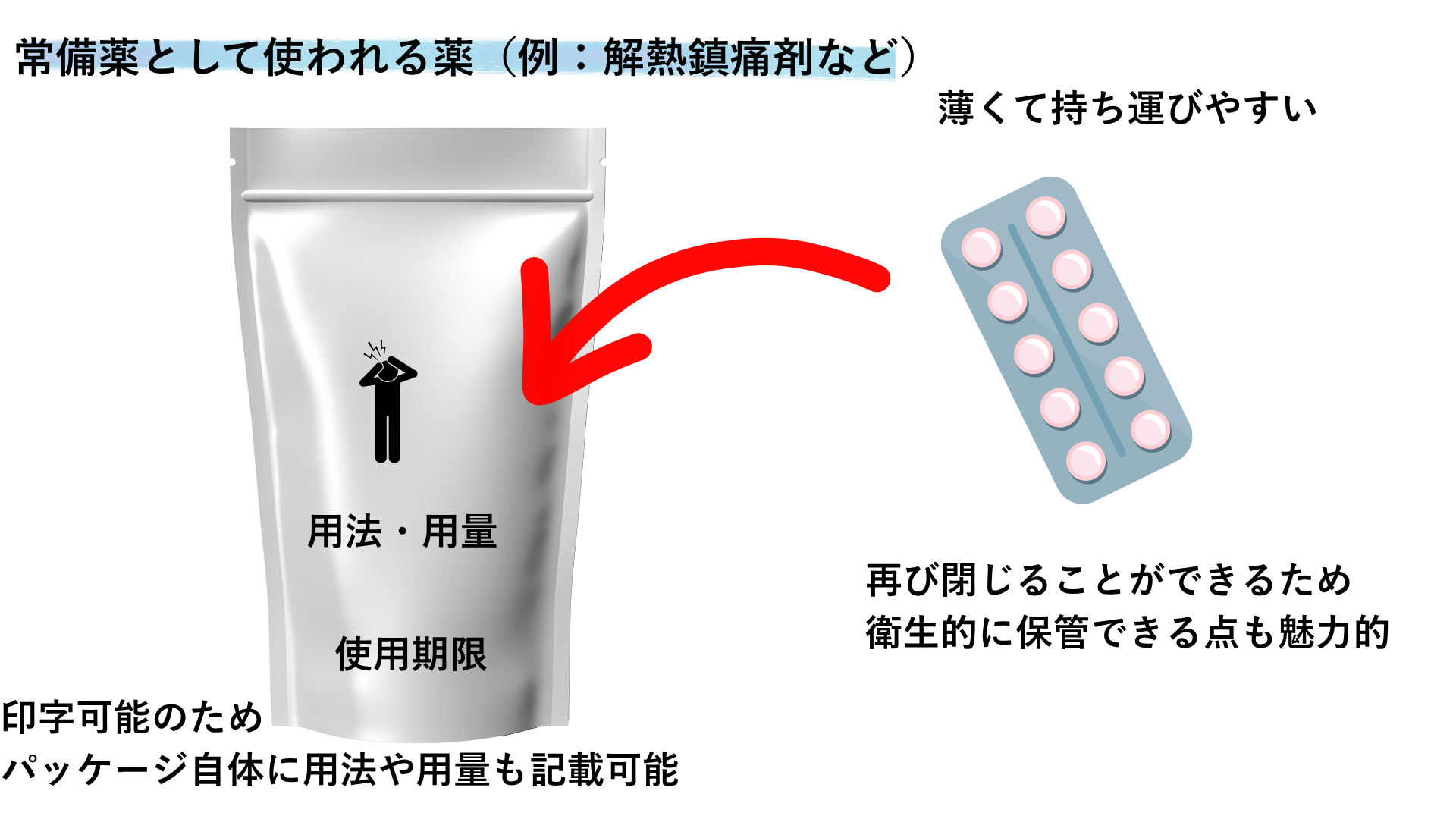 パッケージに薬の名前や用法・用量、消費期限などが記載されていれば、持ち運びに便利だと感じました。例えば解熱鎮痛薬はカバンに入れて持ち歩く方もいらっしゃると思うので、パウチ包装なら管理もしやすく、錠剤がばらばらにならず安心です。直接印字することも可能でしょうか。