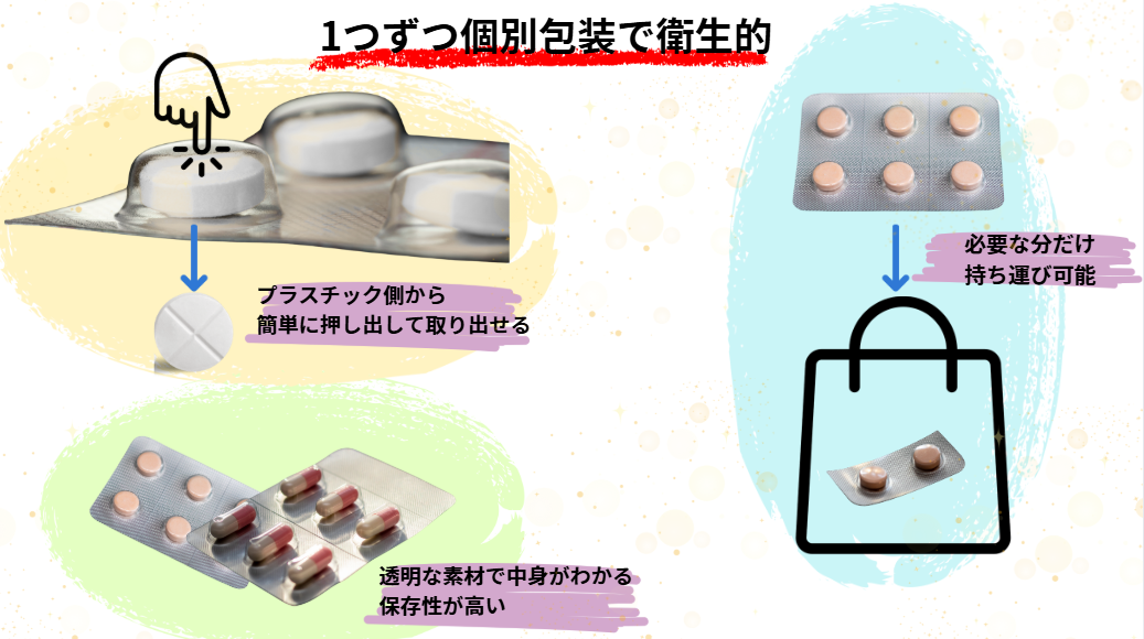 PTPシートは、1錠ずつ個別に包装されているため衛生的で、プラスチック側から簡単に押し出して取り出せます。透明な素材で中身の錠剤やカプセルを確認でき、材料によって酸素や水分を遮断するため保存性も高く、必要な分だけ持ち歩けるなど、利便性にも優れています。