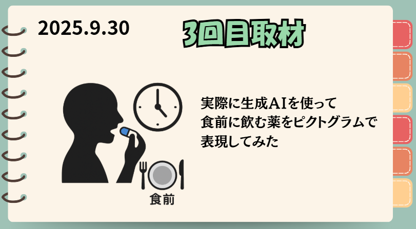 S.Aです。今回の取材を通じて、ピクトグラムにとても興味が湧きました。実際に自分でも生成AIを使ってカラーピクトグラムを作ってみたところ、「食前に飲む薬」と入力するだけで上記のような画像が生成されました。AIはほとんど使ったことがなかったので少し不安でしたが、1回でこれくらいのクオリティが出るなら、少しずつ微調整すればさらに良いものが作れそうだと感じました。ピクトグラムはさまざまな場面で活用されていますが、特に薬のパッケージのように多くの人が使う場面で用いると、服薬支援に非常に有効であると感じました。取材内容はかなり面白い内容で、自分自身もデザインについて学んでみたいと強く感じました。