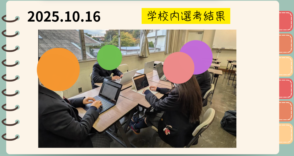 ~2025.10.16~ チームリーダーのSAです。学校内選考無事通過しました。これで正式に4回目のWebコンテストにエントリーすることになります。今回は1年生もいるので、学年の垣根を越えていいコミュニケーションが取れたと思っています。特に1年生は、初めてとは思えないくらい積極的でした。これなら最後まで頑張れます。