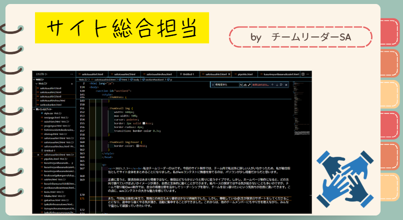 私はチームリーダーのSAです。今回のサイト制作では、チーム内で私以外に詳しい人がいなかったため、私が総合担当としてサイト全体をまとめることになりました。私がWebコンテストに熱意を持てるのは、パソコンが少し得意だからだと思います。