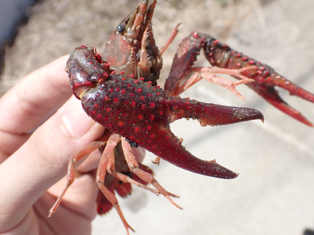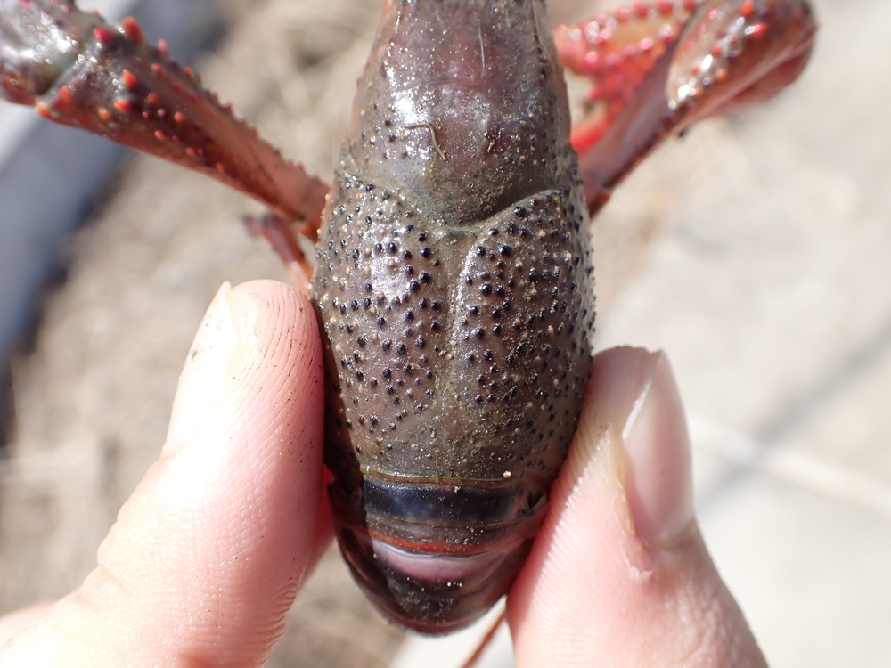 成体の体色は暗赤色、若い個体は茶褐色、ウチダザリガニと違いハサミの付け根に白点を持たない、ハサミには赤いイボが多数ある。ニホンザリガニと違い背中の線が接しない。高水温、低酸素、水質汚染に耐性がある。