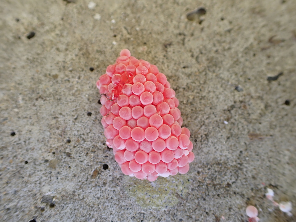 雌雄異体。雌貝が夜間水上に出て植物体や水路壁に鮮紅色の卵塊を生む。1卵塊に200~300卵程度で、産卵頻度は3~4日に一度、約10日で孵化し、2ヶ月程度で成熟する。鰓と肺様器官を持ち、水中では鰓呼吸、空気中では肺呼吸する。雨の日などは