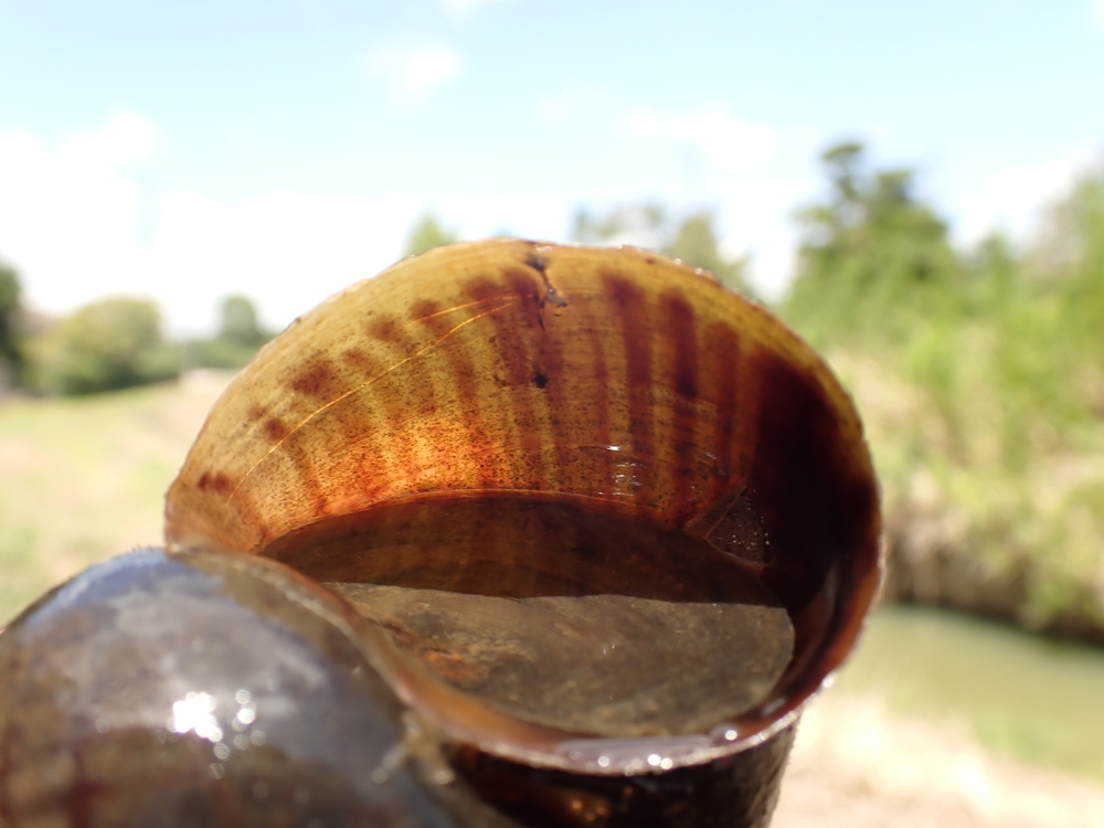 殻色は茶褐色から緑褐色、10〜15本の帯が入る。軟体部は黒色、在来のタニシとの見分け方は線の有無と渦巻きのへその部分の穴が深く空いている。螺旋部の一番下の部分が太い。角質の蓋を持つ。エラと肺様器官を持ち、陸は肺呼吸、水中はエラ呼吸、低温に弱い。ピンク色の卵を産み付ける。卵には毒がある。