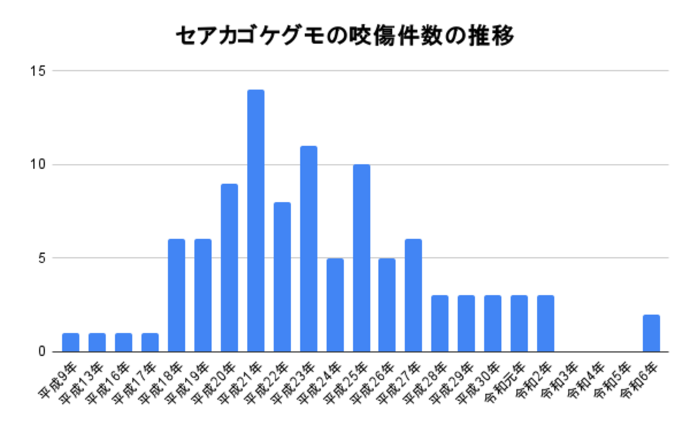 例に大阪府でのセアカゴケグモの被害を見てみると、一番多いときでは一年間で15人がセアカゴケグモに咬まれています。