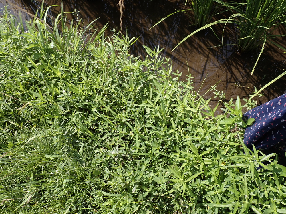 平塚内のナガエツルノゲイトウが生えている水田にバスで向かい、基本は手でむしるようにして駆除しますが、なかなか抜けないものは始まる前に渡された鎌を使って刈り取ります。ナガエツルノゲイトウは水のあるところにしか生えないので、水回りを重点的に探しました。