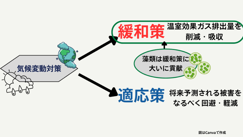 気候変動対策は、地球温暖化の原因となる温室効果ガスの排出量を削減・吸収する「緩和策」と、将来予測される気候変動による被害をなるべく回避・軽減するための「適応策」の大きく二つに分類されます。文部科学省及び気象庁が作成した『日本の気候変動2025』によると、今後追加的な緩和策を講じられなかった場合、年平均気温が約4.5℃上昇すると予測されています。こうした気温上昇以外にも、様々な気候変動による影響が生じることが予測されています。このような中、藻類は様々な特性を活かし、「緩和策」に大いに貢献できると考えられます。