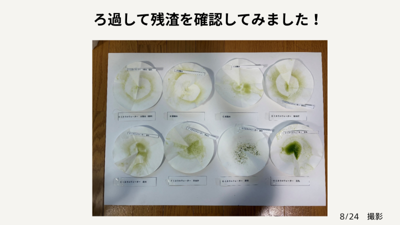 下の写真の残渣物を視覚的に判断したところ、豆乳を加えたものが1番、藻類が多く育っていました。栄養を少し与えてたもののほうがよく育つということがわかりました。