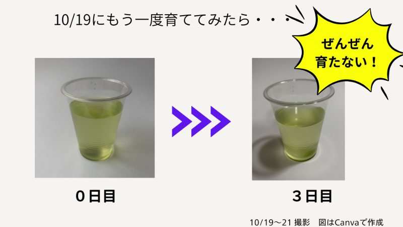 藻類がいつでも育つのかを確認するため、1回目、2回目の実験から約2ヶ月後の10/19~10/21の3日間で育成を再度、行ってみました。今回は、栄養などは加えずに水と太陽光だけで育ててみました。