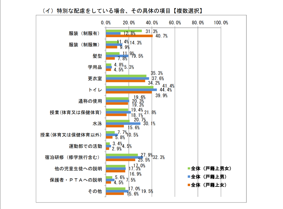 文部科学省が2014年に公表した「学校における性同一性障害に係る対応に関する状況調査について」では、全国の学校の41.4%で「職員用トイレや多目的トイレを使用する」といった配慮が行われているという結果が出ています(図9)。