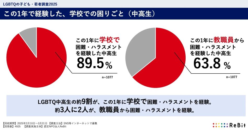出典:特定非営利活動法人Rebit「【LGBTQの子ども若者、約5千名の調査公開】過去1年に、中高生の9割が学校で困難やハラスメントを経験し、うち64%は教職員が要因。10代の57%が自殺念慮を経験する等、喫緊な状況が明らかに。」