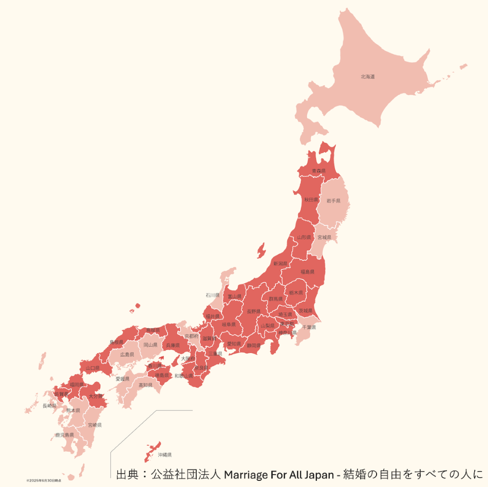 濃い赤色は各都道府県の全域で、薄い赤色は各都道府県の一部の地域でパートナーシップ制度が認められていることを表します。