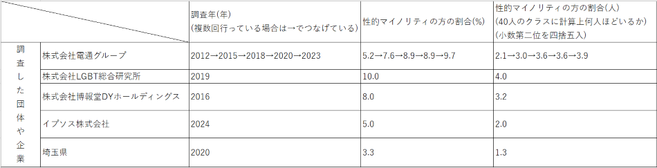 日本人口のうち、LGBTQ+などの性的マイノリティの方の割合を調べる調査は複数の団体や企業により行われてきました。その一部をまとめたのが以下の図1です。