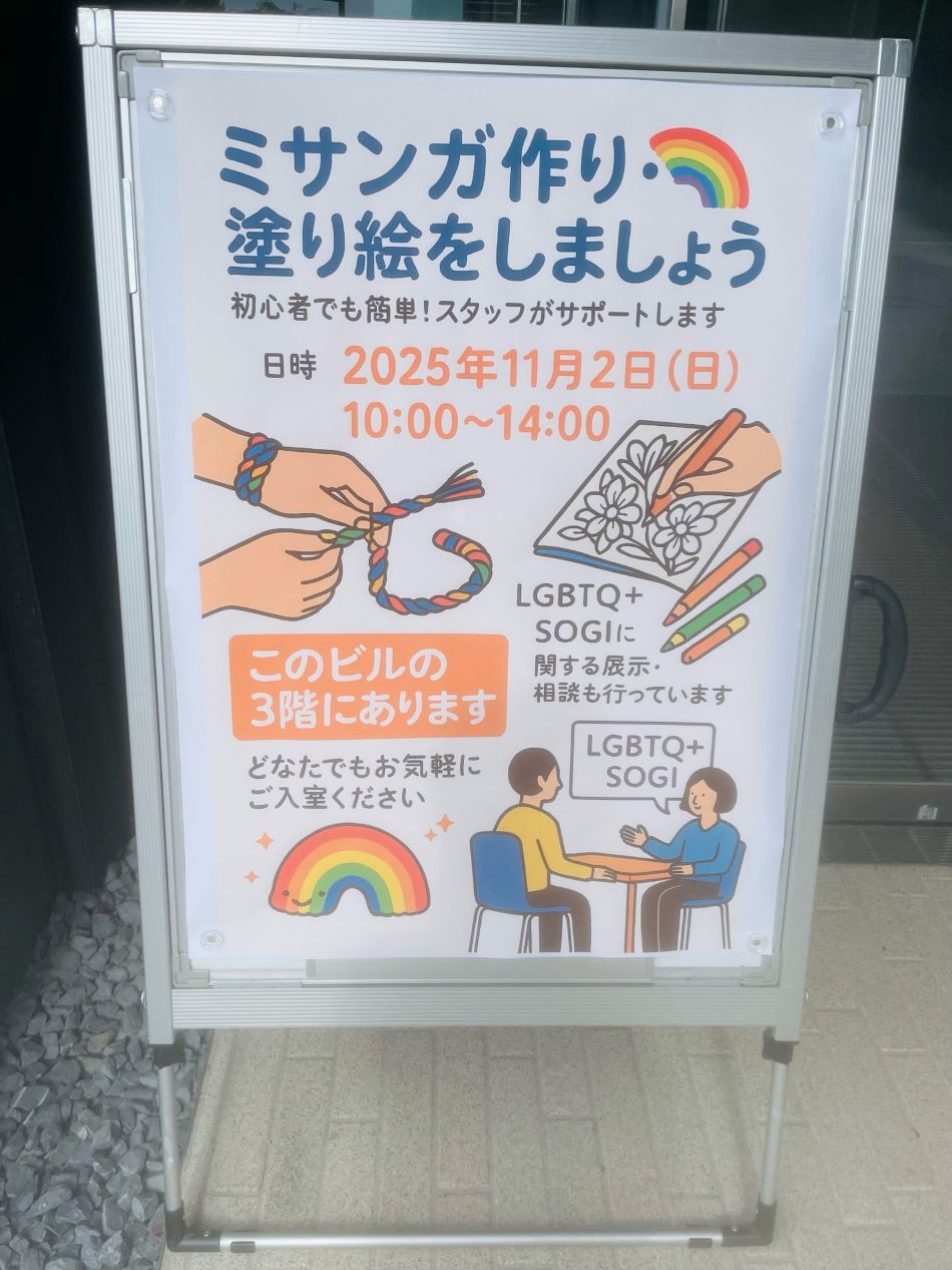 2025年11月、メンバーの1人が横浜市内の大学のオープンキャンパスで行われていたプライドフェアに行ってきました。 大学と特定非営利活動法人SHIP(前ページで取材を掲載しています)などの団体によるLGBTQ+への取り組みの発信が行われました。ここでは、LGBTQ+に関する展示とミサンガづくり、塗り絵が行われていました。(図19)