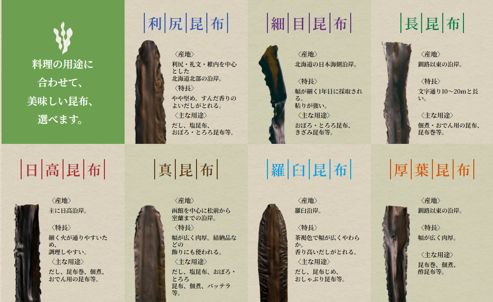 北海道の夏の風物詩ともいえる昆布漁は、昆布が大きく成長する7月から9月が最盛期です。 太陽の光を浴び、時間と手間を惜しまずに干しあげた昆布には、うまみ成分がギュッとつまっています。 昆布は北海道全域で漁獲されますが、地域によって獲れる種類に違いがあり、出汁をとったときの香りや味・色、さらに料理に用いた時の味や食感もさまざまです。 用途や好みに合わせて利尻昆布羅臼昆布長昆布厚葉昆布日高昆布真昆布細目昆布があります。
