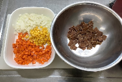 2カップ、ポークジャーキー 30グラム、玉ねぎ 1/4個、人参 1/4個、ホールコーン 30グラム、