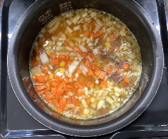 4、1の炊飯器に2・3とホールコーンを米の上に乗せるように入れ、コンソメとカレー粉も加えスイッチを入れ炊き上げる。