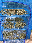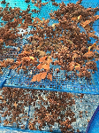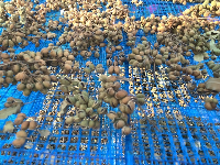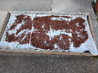 収穫して網に入れて天日干しします。この段階ではまだ水分が多い状態で、ティッシュに包んで潰してみると水分が出てきました。