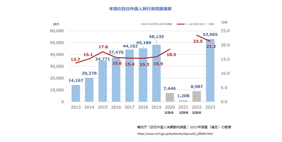 観光庁「2023年度訪日外国人消費動向調査の結果概要」によると、訪日外国人観光客の年間消費額は2013年の1.4兆円から2023年の5.3兆円に拡大しました。そして、今後ますます消費額が増えると予想されています。