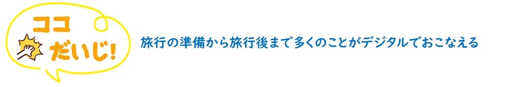 航空チケットやホテルの予約、ビザの取得(必要な場合)、入国申告の申請などの旅行の準備から始まり、旅行中の移動のための交通系ICカード、食事代や買い物代のキャッシュレス決済、スマホで観光地の検索や地図アプリの使用し、旅行後は写真の共有をするのが現在の旅行のスタイルで、多くのことがデジタルでおこなうことができます。