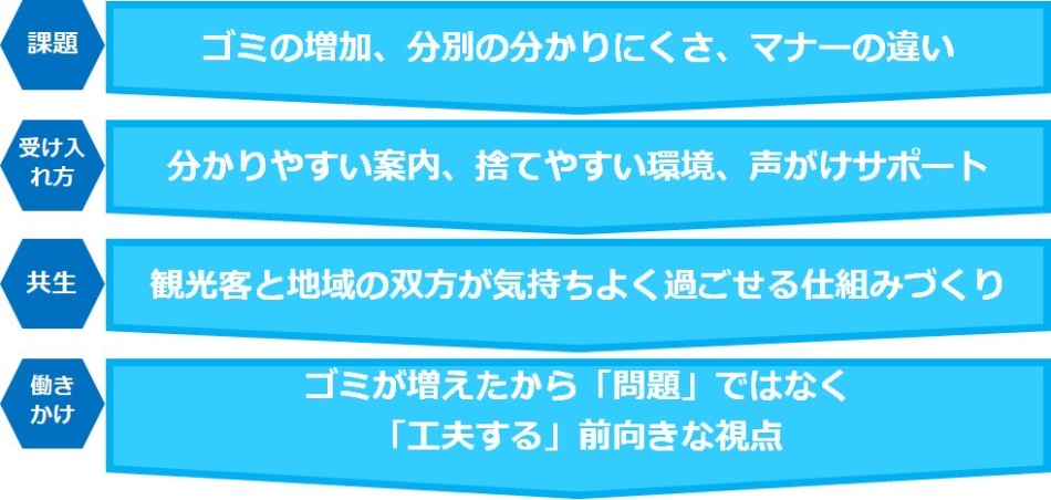 多くの人が訪れる今だからこそ、分かりやすい案内や捨てやすい環境を整え、観光客と地域が共に気持ちよく過ごせる仕組みづくりが必要です。