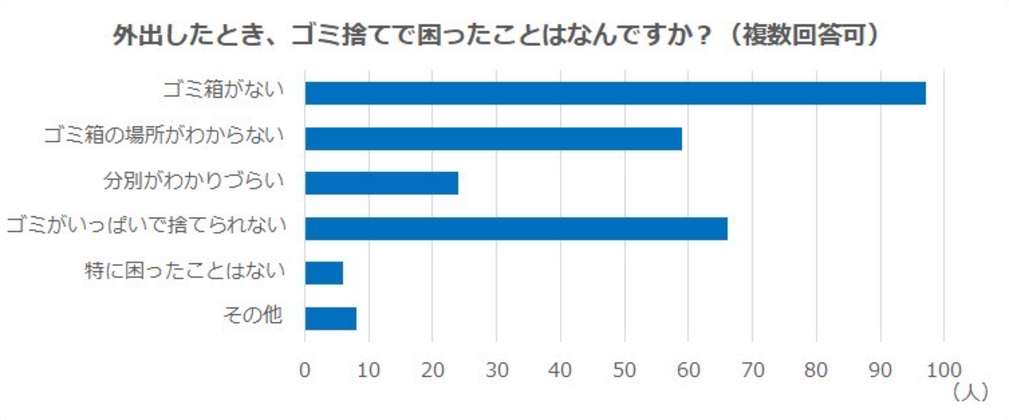 〇ゴミ箱がない 97人 〇ゴミ箱の場所がわからない 59人 〇分別がわかりづらい 24人