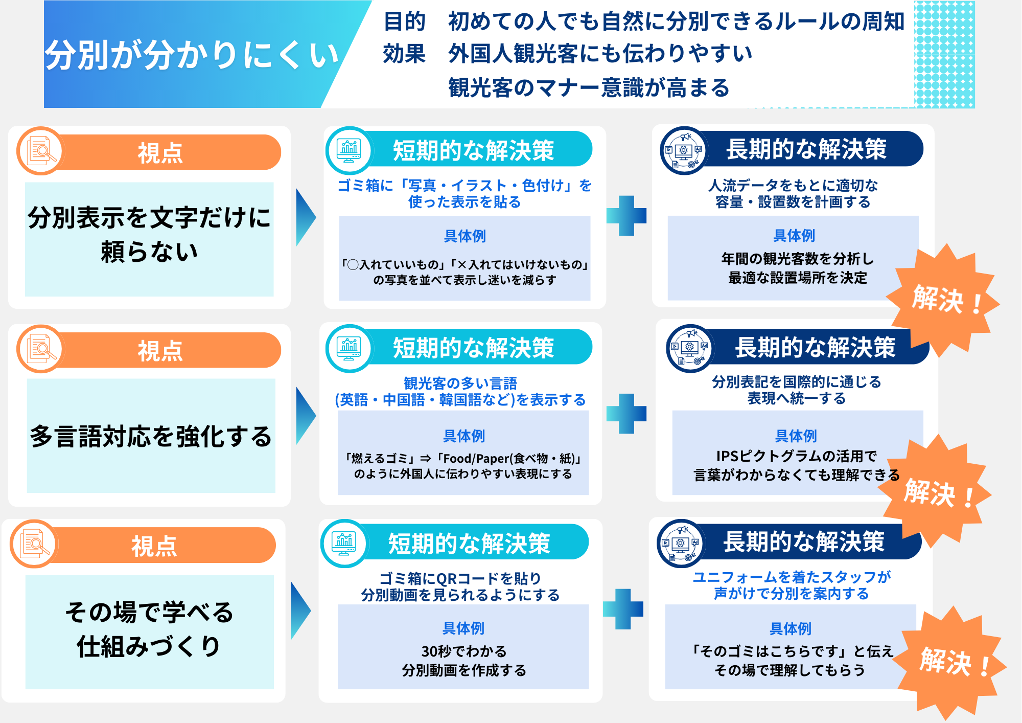 このように、初めて訪れる人でも自然に分別を学べるルールを周知することで、観光客のマナー意識が高まり、観光地全体の環境美化につながります。
