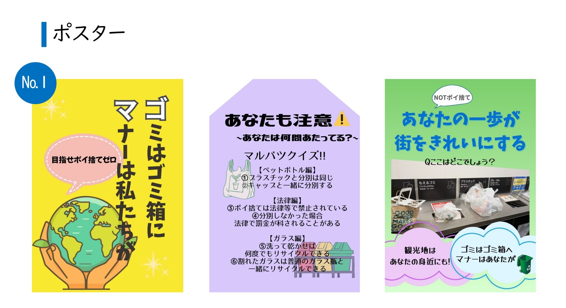ポスターは、目を引きやすく夜でも目立つ黄色を基調に、環境を象徴する地球のイラストを用いることで、国籍を問わずポイ捨ての抑止につながると考えています。